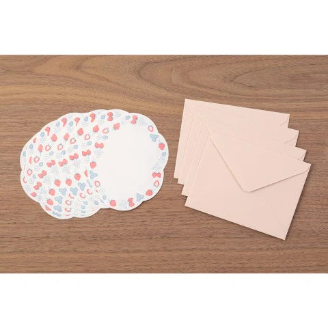 Send charming letters and thank-you notes with this Midori letter set. The letter paper is die-cut into a scalloped oval shape and features a letterpress-printed pattern around the edge. Each set includes eight sheets of letter paper, four envelopes, and a guide sheet with lines for writing horizontally and vertically.