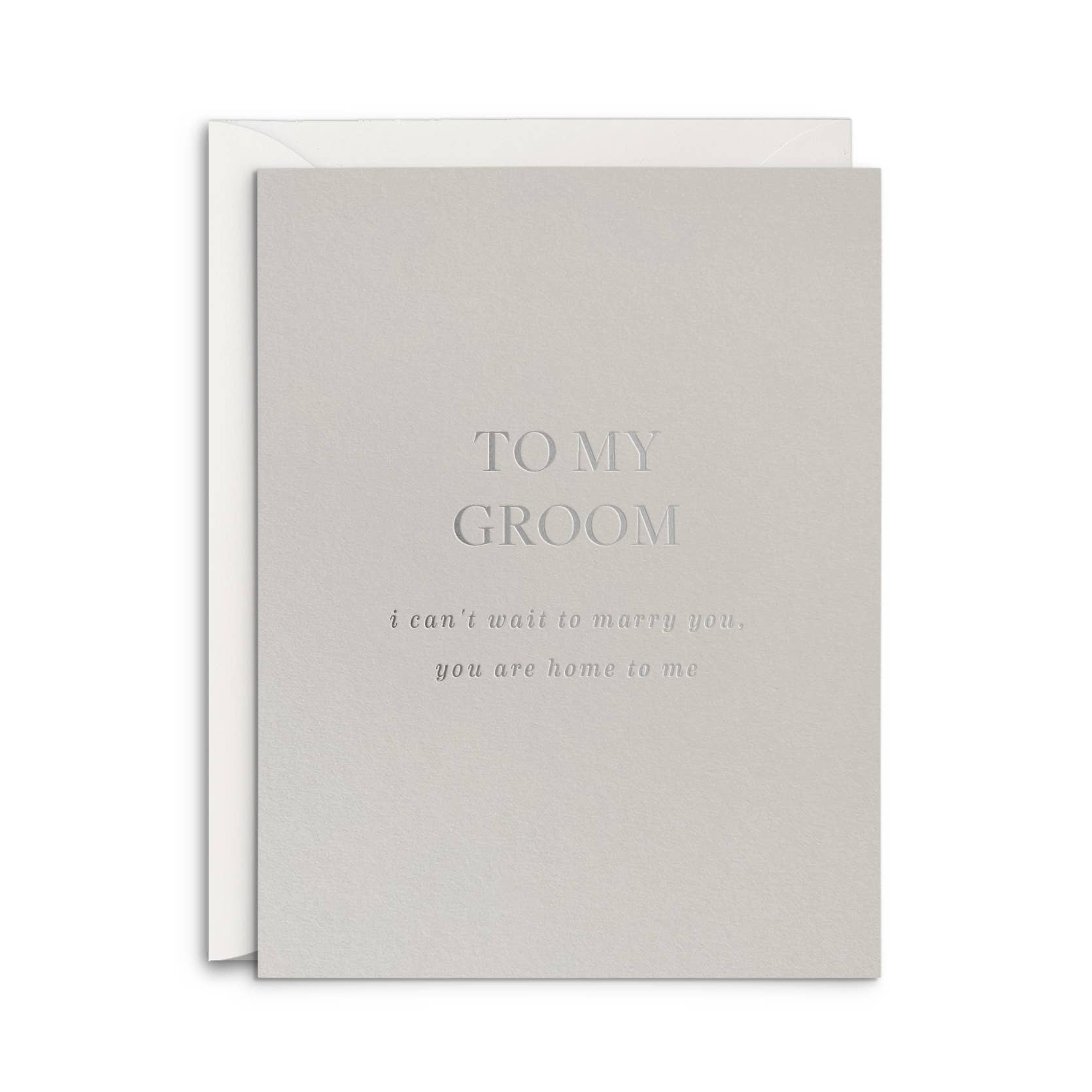 Our To My Groom card is printed with foil stamping on luxe heavyweight textured card stock. Pewter foil on tan paper. From the bride before the wedding.  Folded card with blank interior and envelope. Designed and printed in the USA.