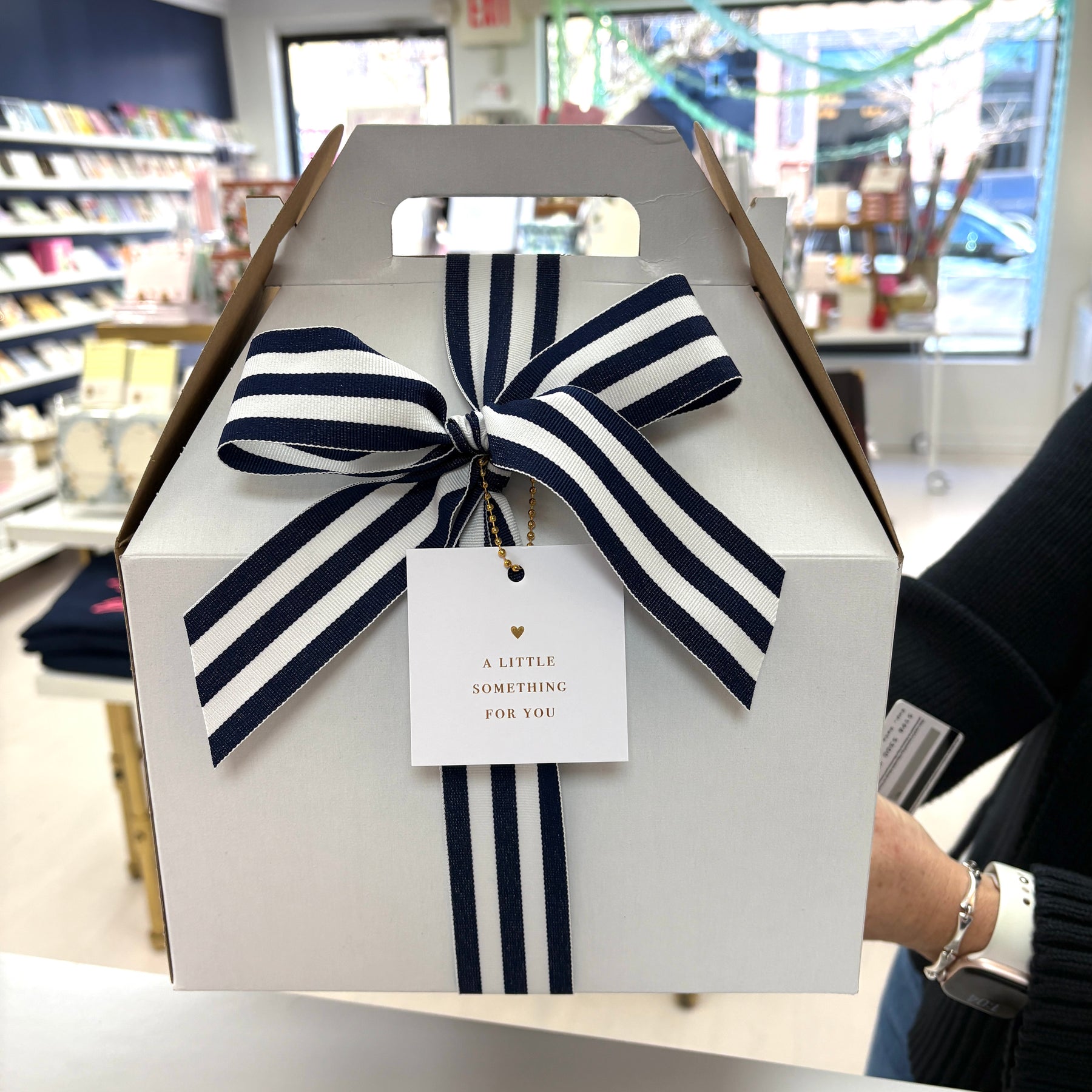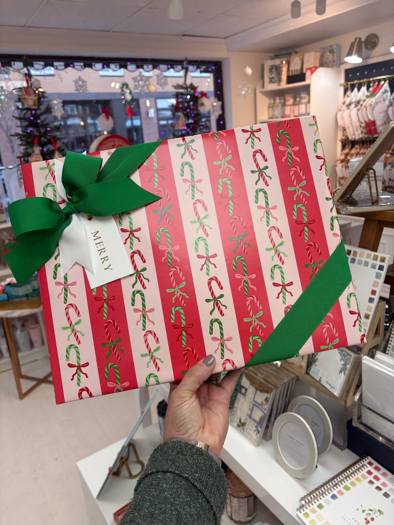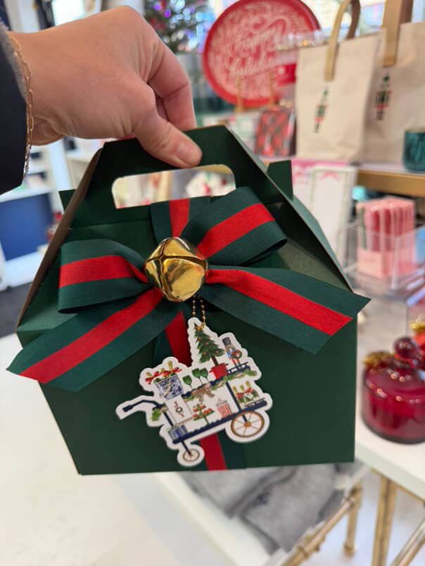 Our team will turn your boxed gifts into festive show-stoppers with bows, ribbons, and all the merry magic you’d expect from GP. Just bring your gift already boxed (we don’t stock boxes)... unless, of course, you’d like to upgrade to one of our famous Greenstar Paperie gable boxes or choose one of our adorable holiday gift bags because both make fabulous wrapping alternatives!
